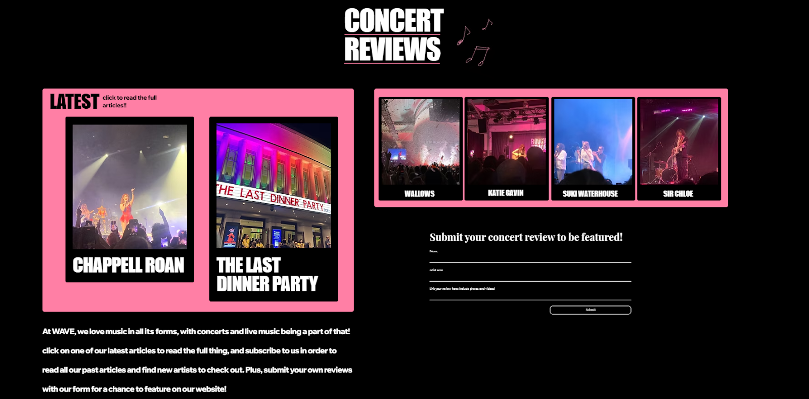 I will create a website with clear synergy with the covers and contents pages of my magazine. I will create this through continuing with the same colour palette, fonts and 'Wave' masthead throughout. I will also include features that go beyond what is included in the contents pages to give the audience an incentive to access the website. I will include opportunities for fan interaction such as competitions to win tickets and submission opportunities, this will create a feeling of connection between the audience and producers and allow them to feel like they have a say in what they read, a common feature in independent magazines. I will also create synthetic personalisation through opportunities to learn more about the teams interests and playlists made by cover stars they can access.